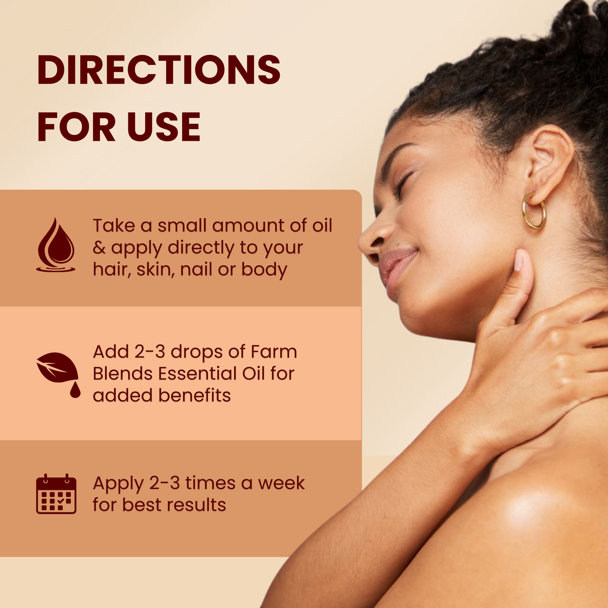 • Take a small amount of oil and apply directly to your hair, skin, nails, or body.