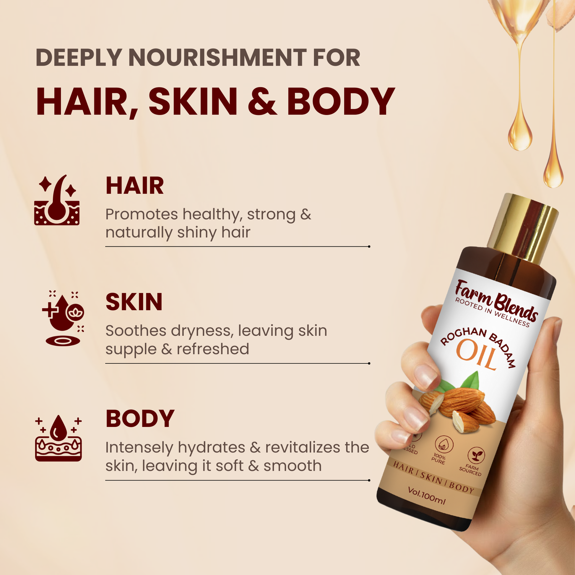 Farm Blends Roghan Badam Oil is a 100% pure, cold-pressed, and farm-sourced almond oil designed for hair, skin, and body care. Extracted from premium Mamra and Gurbandi almonds, this non-refined oil provides deep nourishment. It promotes strong, shiny hair, soothes and hydrates the skin for a natural glow, and revitalizes the body, leaving it soft and smooth.