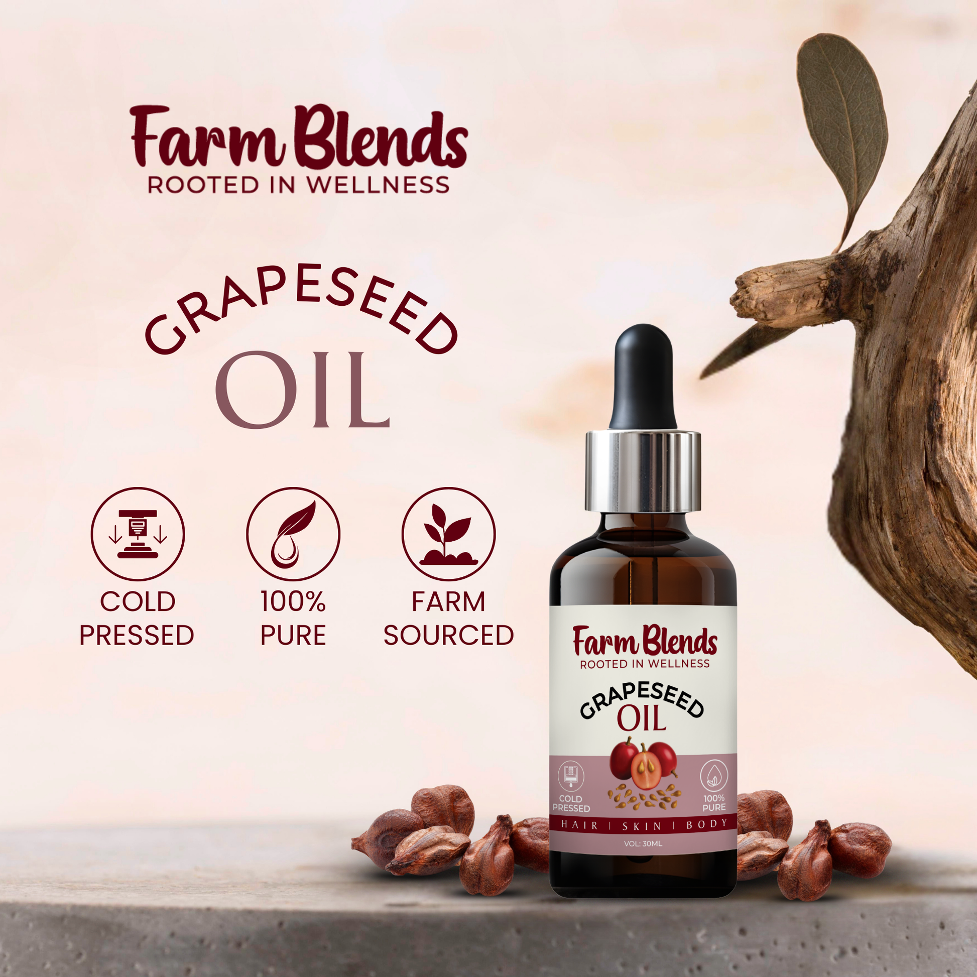 Discover the lightweight secret to radiant skin and hair with FarmBlends Grapeseed Oil. This 30ml bottle contains 100% pure, natural, and organic oil, cold-pressed and farm-sourced from grape seeds. This fast-absorbing, chemical-free oil is a versatile essential for your daily beauty routine, providing deep nourishment for your hair, skin, and body without any greasy residue.